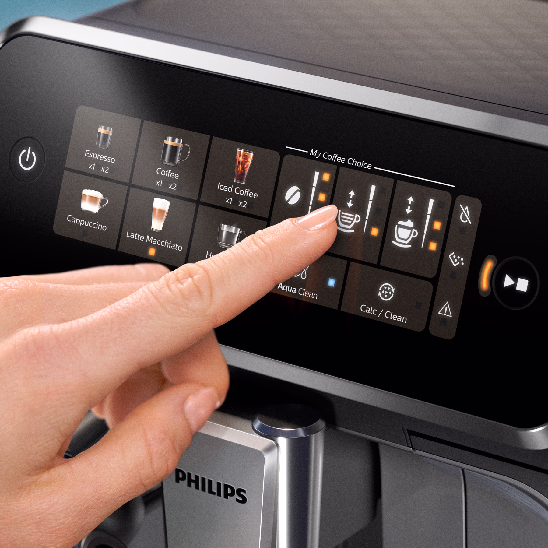 Espresso, koffie, americano, cappuccino, latte macchiato en heet water – eenvoudig te selecteren via het intuïtieve display.